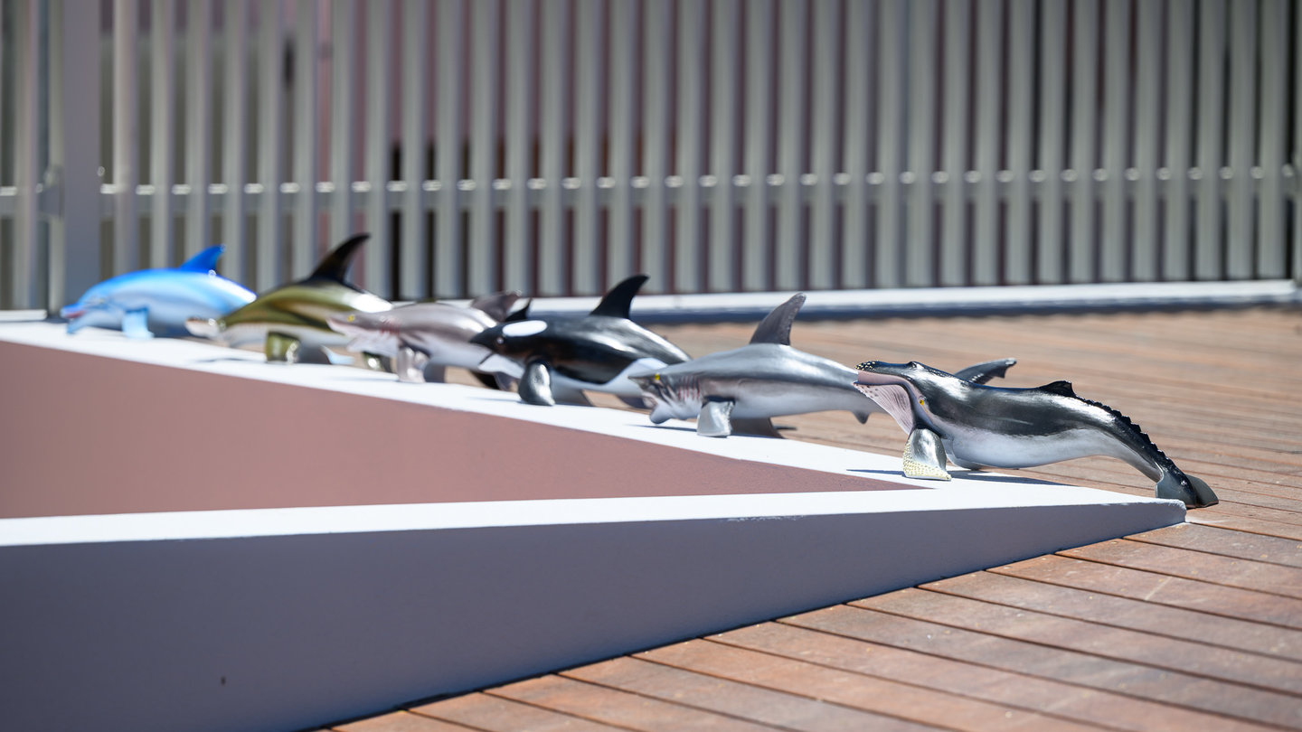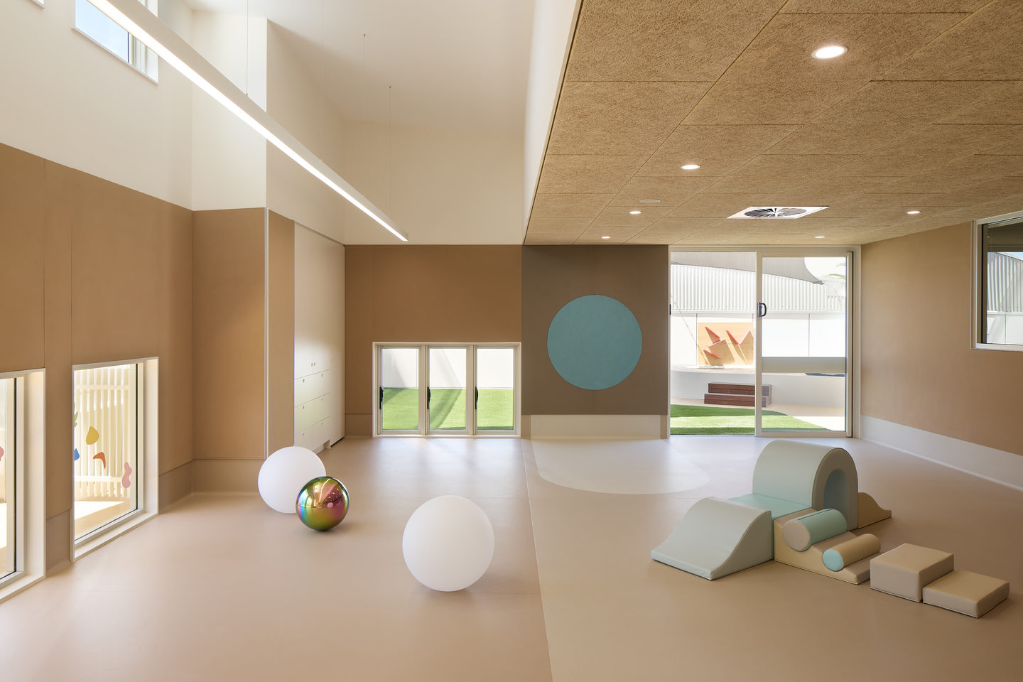 The outdoor areas include two external playrooms for physical activity and exploration and a central courtyard with landscaping, sandpits, and water play areas to enhance sensory experiences and outdoor learning.